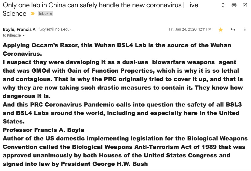 That second email from Boyle carried the headline of a piece he was forwarding from Live Science: “Only one lab in China can safely handle the new coronavirus” which apparently is how he confirmed the existence of the lab in Wuhan. But the piece treated the location of the lab as a coincidence: “The lab happens to sit in the center of Wuhan, the city where the newly identified coronavirus first appeared.” (The date on the piece now is “last updated May 05, 2020” — but it clearly existed on Jan. 24.)