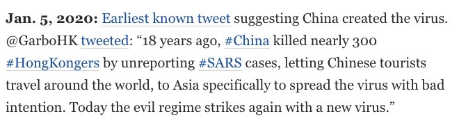 Will Jones of the Brownstone Institute recently claimed: “The first known mention of the idea that the coronavirus may have originated in a Chinese lab appeared on January 9, 2020 in a report by Radio Free Asia (RFA).” And Glenn Kessler of the Washington Post has in “Timeline: How the Wuhan lab-leak theory suddenly became credible” bizarrely credited a tweet that was just rank speculation and didn’t actually mention the existence of any labs in Wuhan: