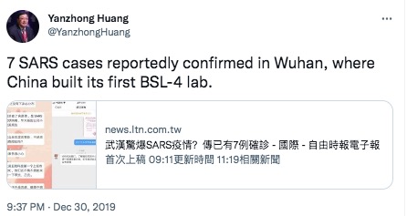 In fact, Yanzhong Huang, senior fellow for global health at the Council on Foreign Relations, tweeted in understated manner on Dec. 30, 2019: “7 SARS cases reportedly confirmed in Wuhan, where China built its first BSL-4 lab.”