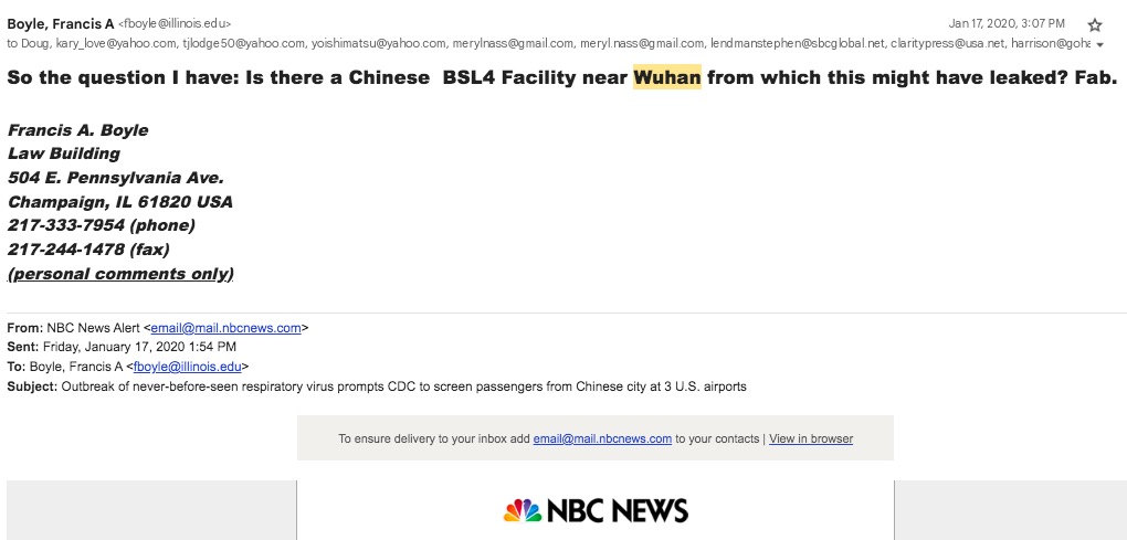 On Jan. 17, 2020, I got an email from Francis Boyle, a professor of law at the University of Illinois. Among Boyle’s accomplishments was that he wrote the US domestic implementing legislation for the Biological Weapons Convention called the Biological Weapons Anti-Terrorism Act of 1989.