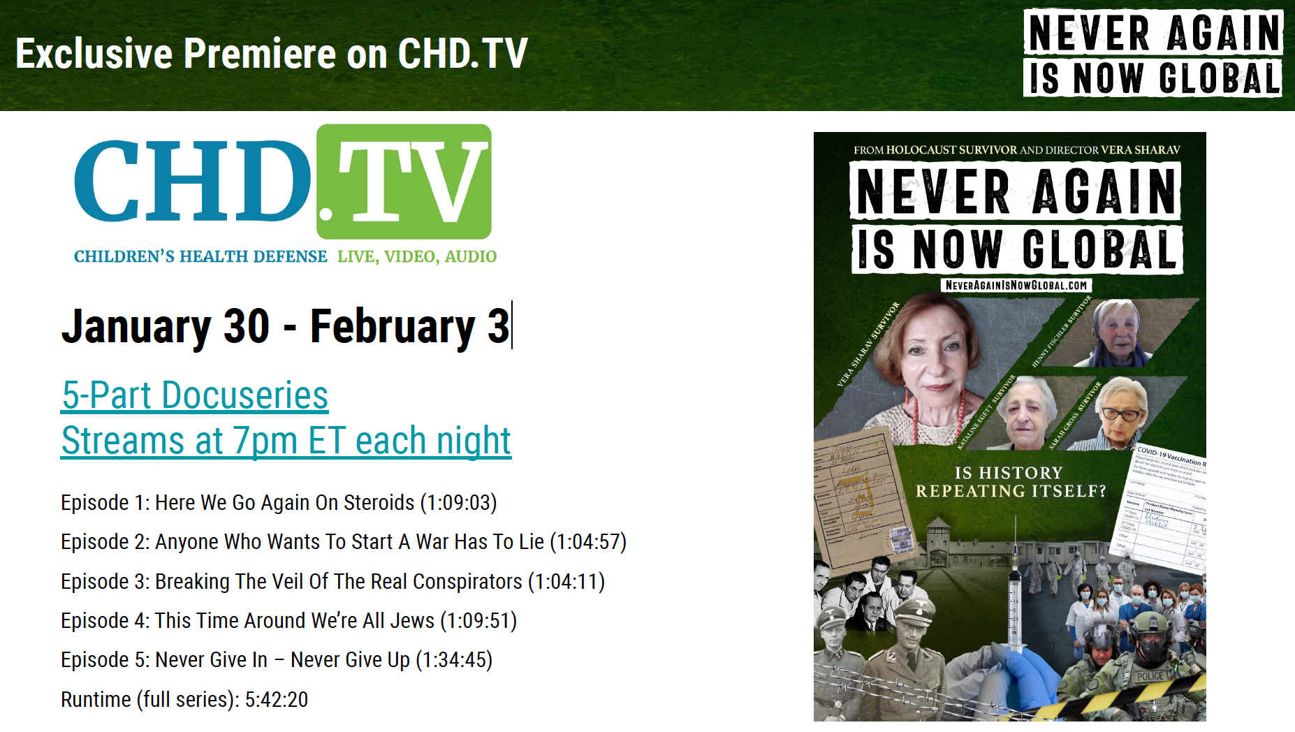 Children’s Health Defense is committed to defending children’s health and preserving the fundamental rights of all humans. We are honored to premiere this historical docuseries on CHD.TV and support the courageous activism of Vera Sharav as she shares her dire warning with the world.