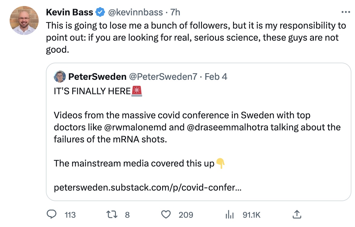 But he was not impressed with the talks by me, Aseem Malhotra, Robert Malone, Sasha Latypova. Guess what? This was not a science conference in Stockholm. It was a conference about what has really been going on these past three years. He likes the straw man argument.