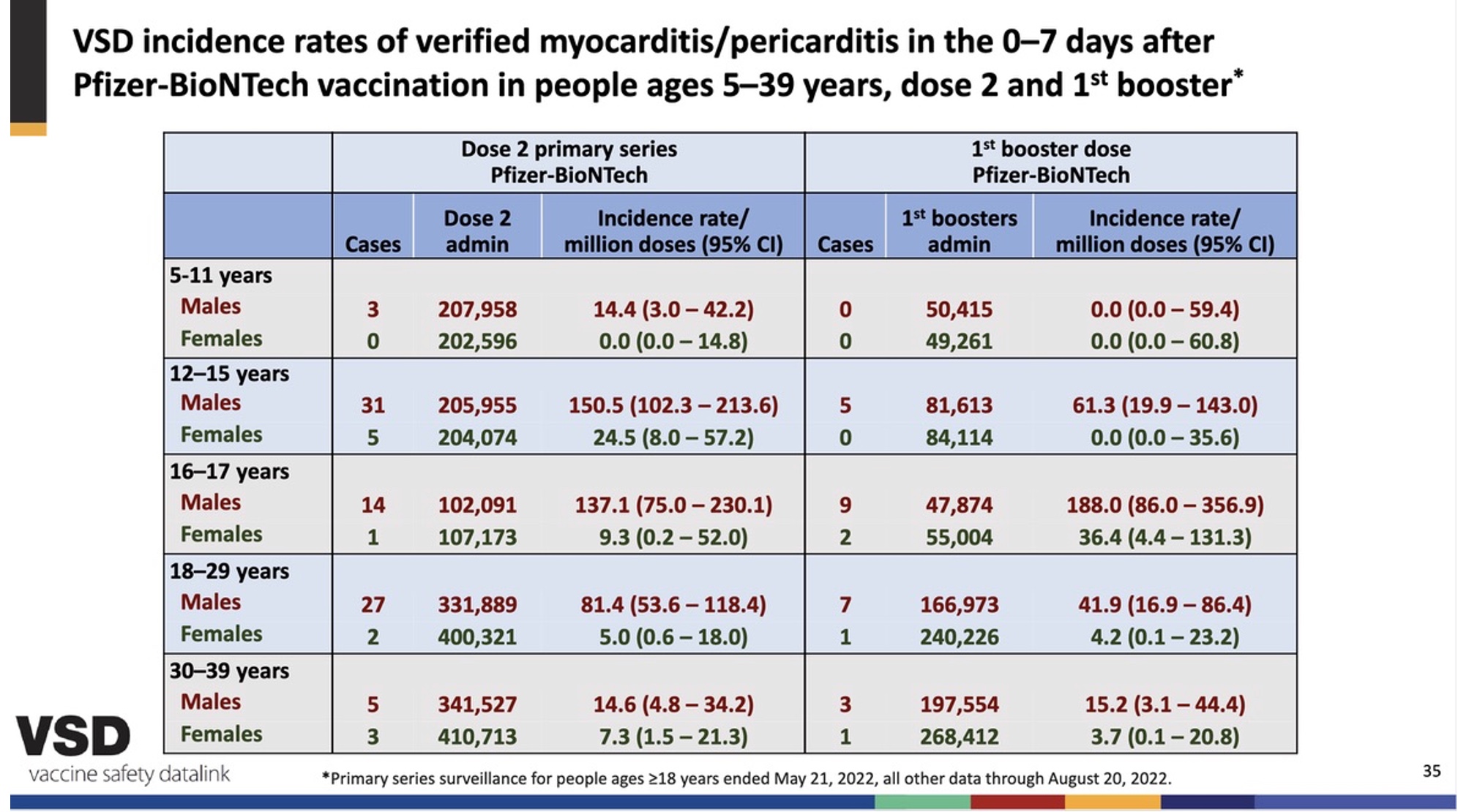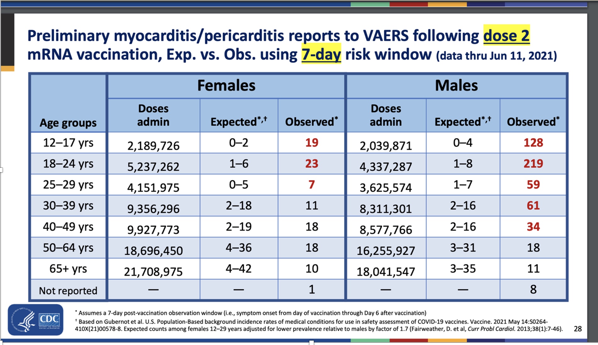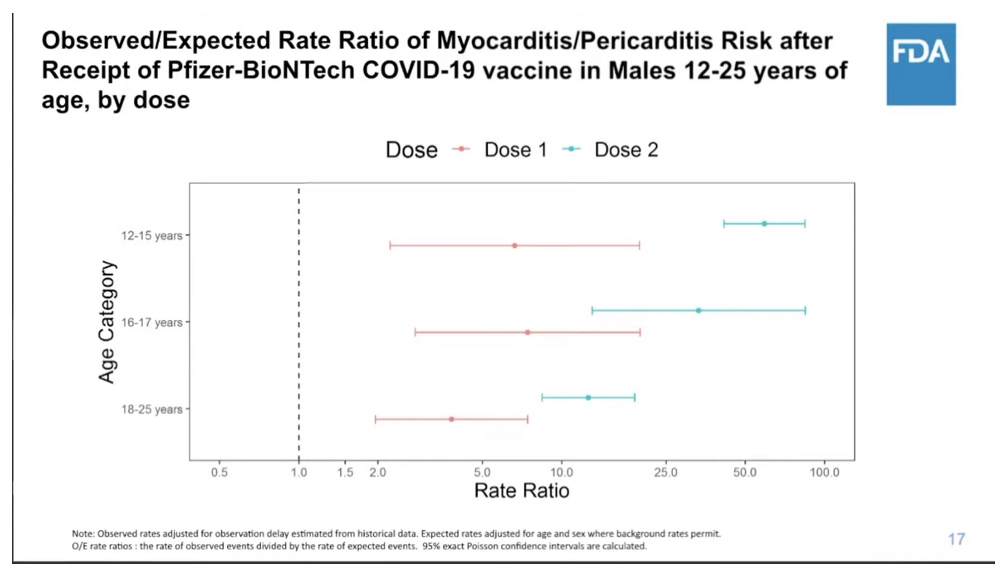 We now know that the risk of COVID vaccine-induced myocarditis is high in teenagers (up to 1 diagnosed case per 5,000 vaccine doses according to the CDC,) or up to 30-90 times the baseline risk in the unvaccinated (see attached CDC and FDA charts), and the benefit of vaccination for healthy American children, almost all of whom have been exposed, is miniscule.