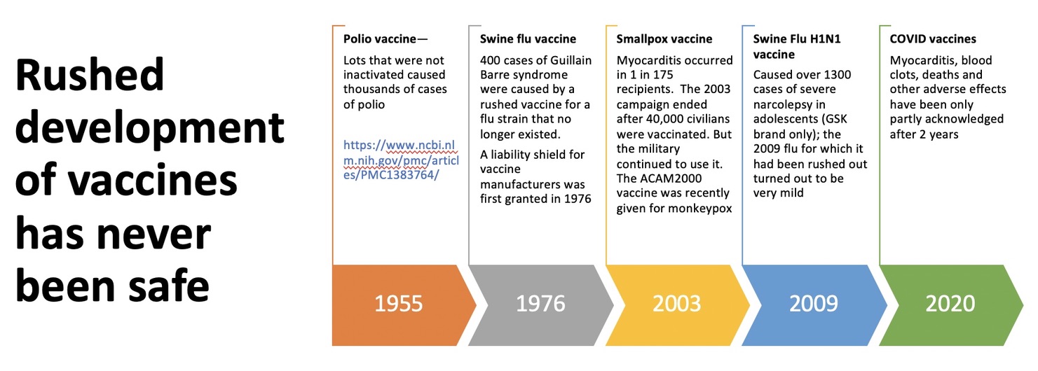 I’ve provided a graphic with 5 historic examples of the unanticipated problems that arose when inadequately trialed vaccines were rolled out for general use.