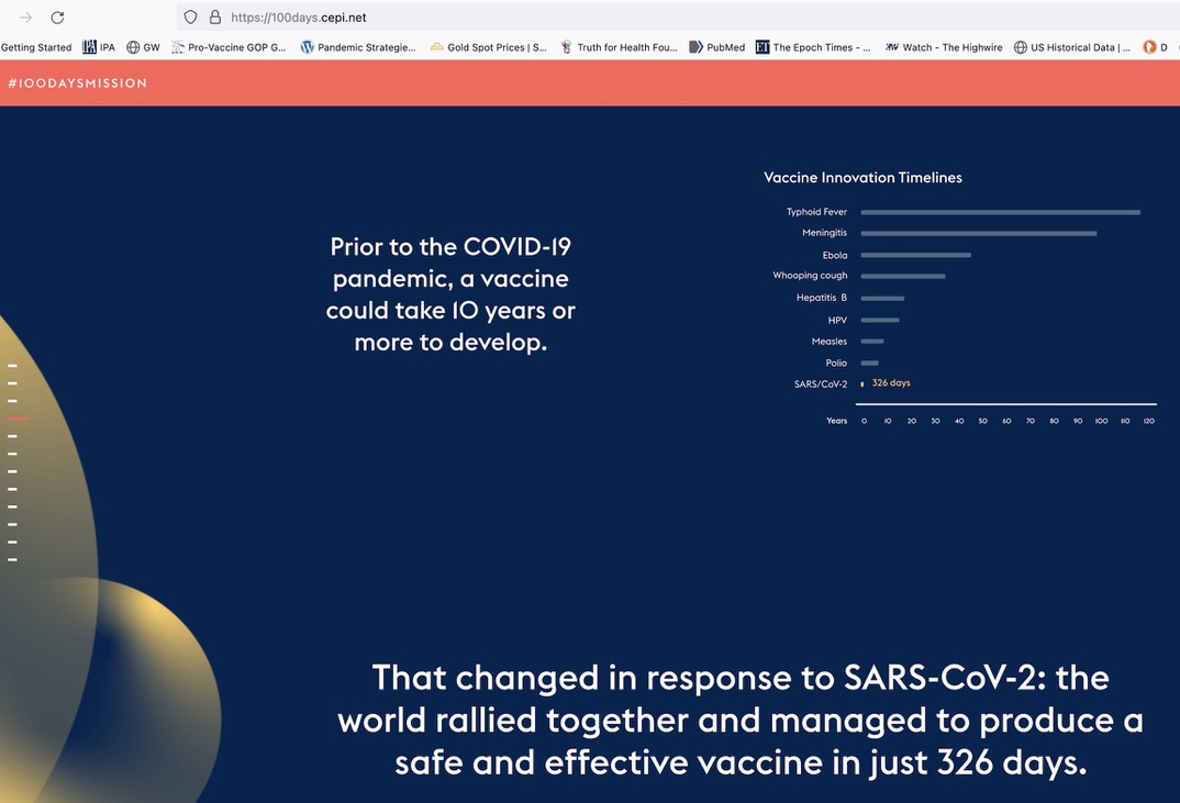 The Coalition for Epidemic Preparedness Innovations, also called CEPI, funded by the Gates Foundation, Wellcome Trust, and 32 countries including the US,[6] promises to roll out vaccines for the next pandemic in only 100 days. I can assure you that there will be no time for human testing or licensure.