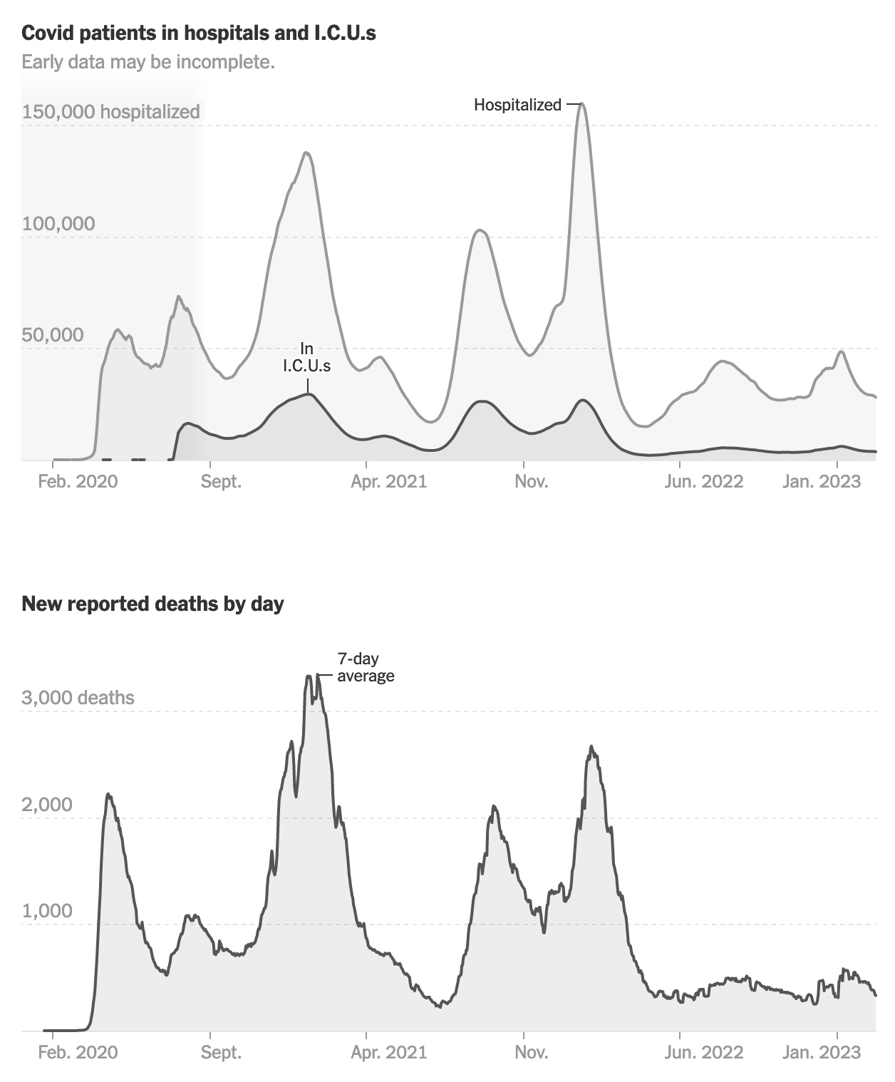 Note the ICU numbers, which have been very low now for 9 months—thank you, Omicron! https://www.nytimes.com/interactive/2021/us/covid-cases.html