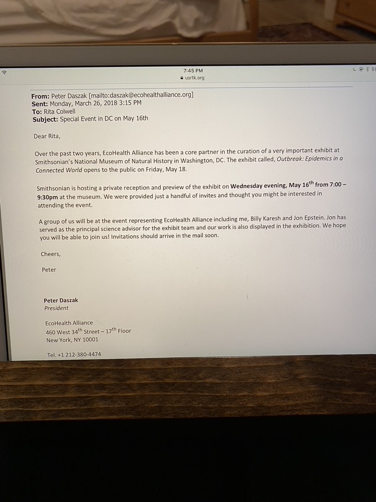 Peter Daszak is buddies with Rita Colwell. Who is she? How about the former head of the National Science Foundation? Someone who worked with the CIA on anthrax. Someone who had huge pots of money to dole out.