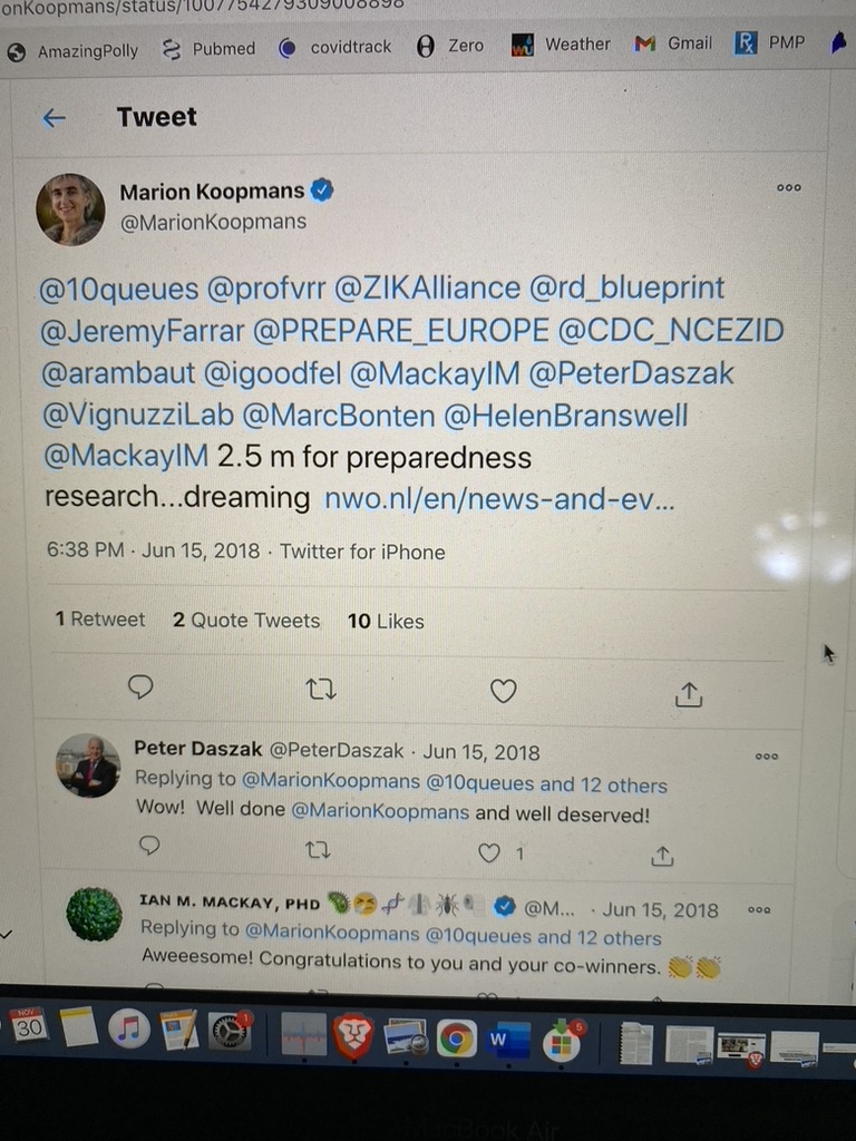 Marion Koopmans (on the WHO COVID origins investigations committee, and on Peter Daszak’s Lancet COVID investigations committee) was celebrating winning a 2.5 million grant for “preparedness” “research.” Who was she celebrating with?