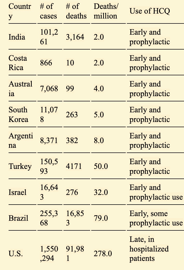 Below is an interesting compilation from Elizabeth Lee Vliet, MD, who writes, “Examples from the world data on May 18, 2020, which is updated daily, show how [some] Third-World countries are faring far better than the U.S.” The countries doing well are using HCQ routinely.