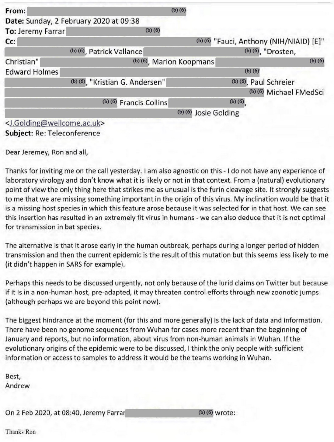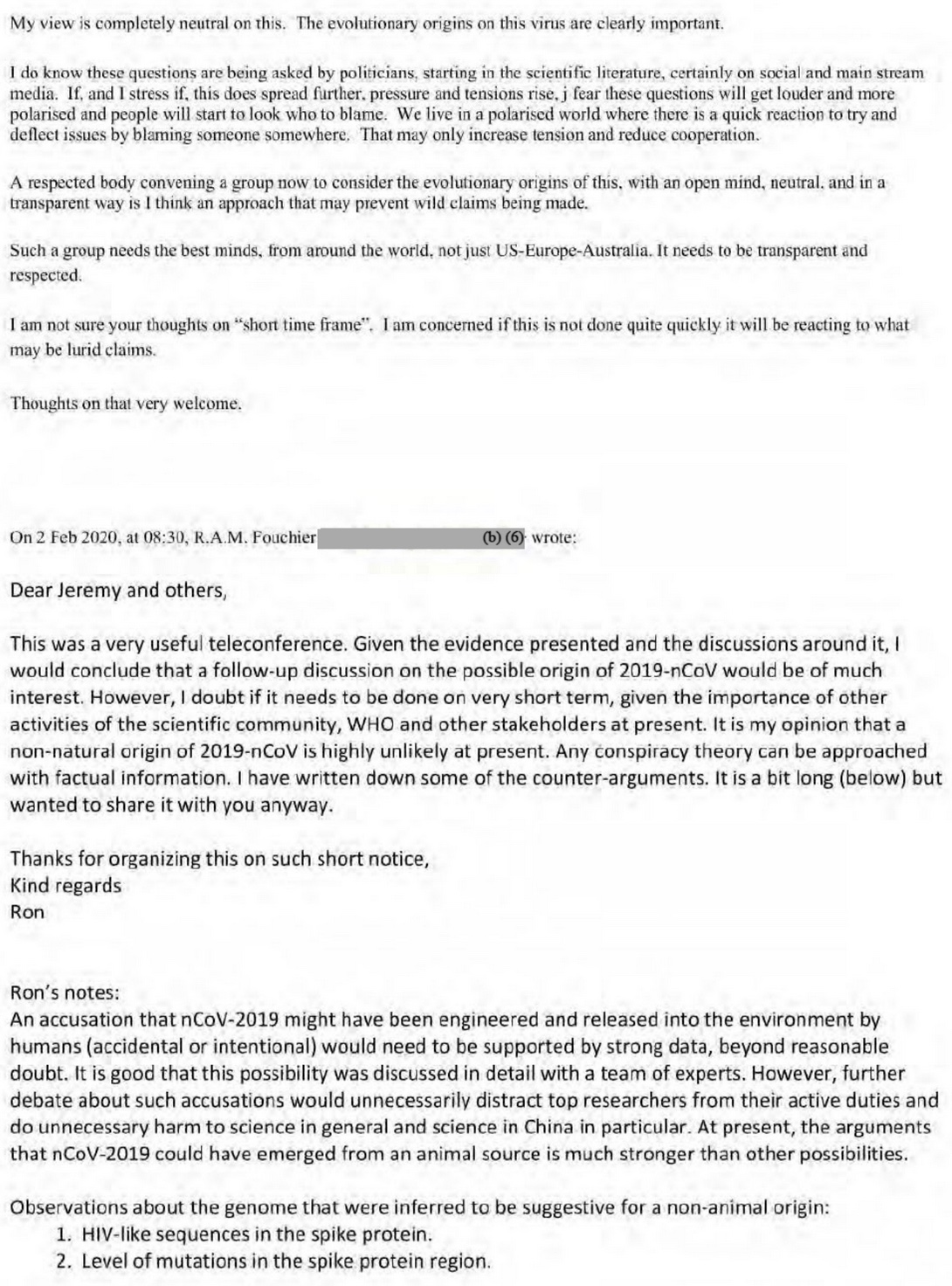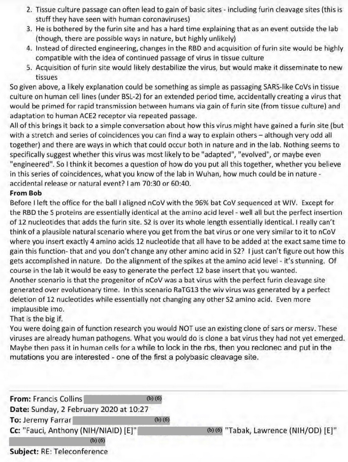 UPDATED April 9 and 11. The unredacted Fauci-Farrar emails of Feb 1-2, 2020. Ron Fouchier tells us 6 reasons the genome does not look natural, and how to shoot each one down.
