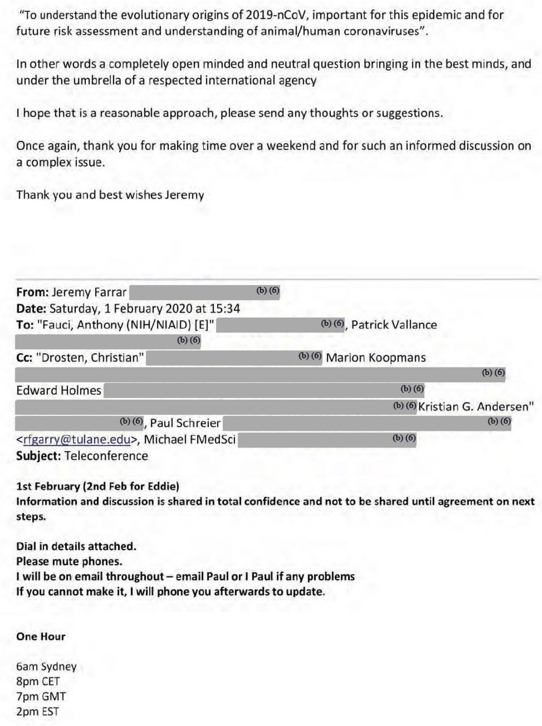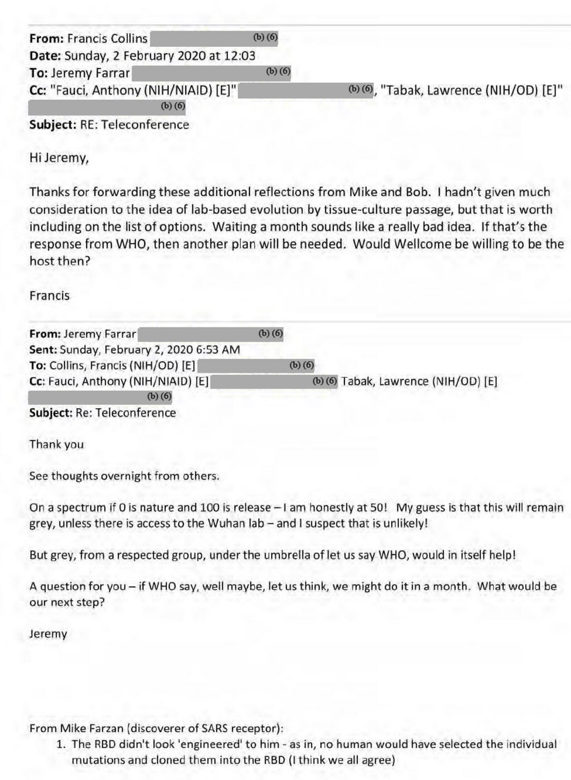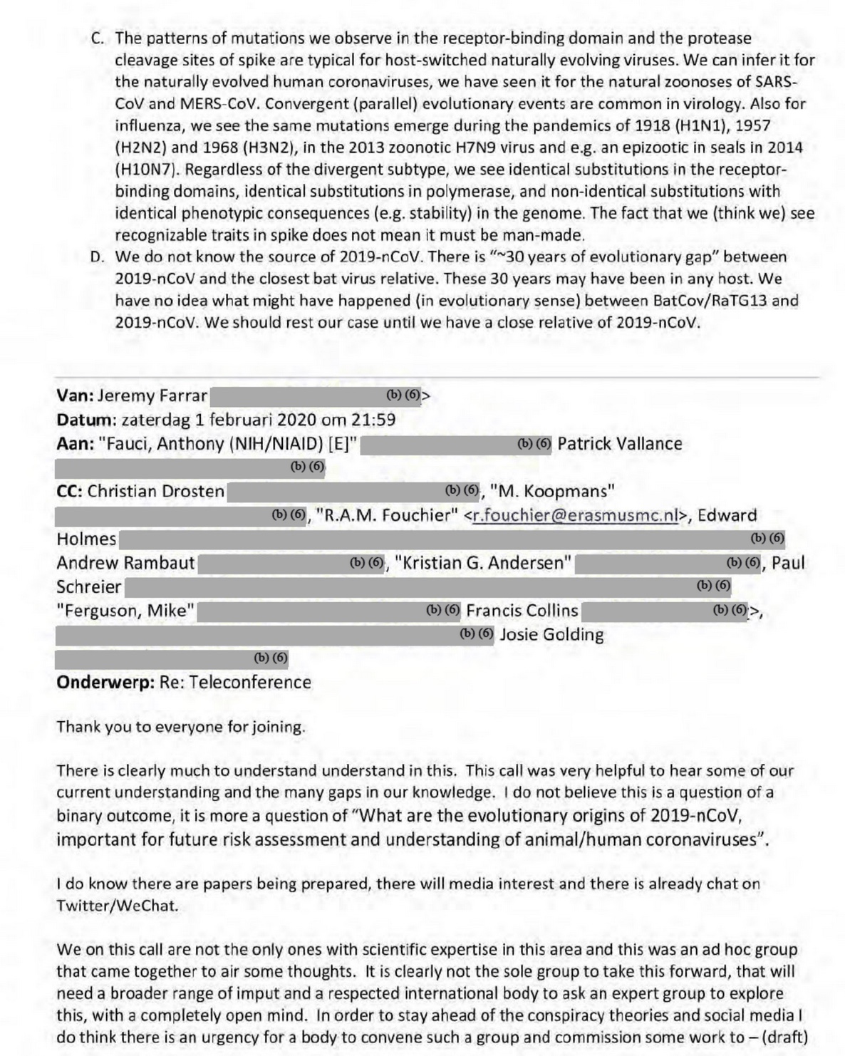 UPDATED April 9 and 11. The unredacted Fauci-Farrar emails of Feb 1-2, 2020. Ron Fouchier tells us 6 reasons the genome does not look natural, and how to shoot each one down.