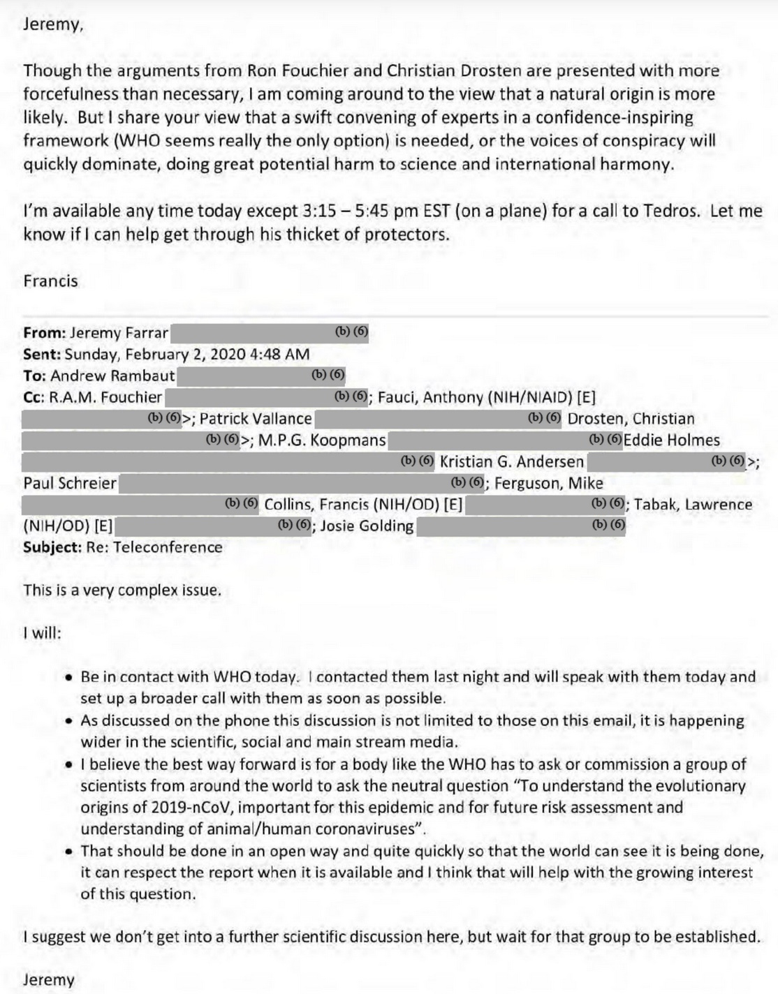 Here Jeremy is setting up the WHO coverup, but apparently Tedros and Bernhard are not keen to participate. [This I learned from a different set of emails.] BTW in case you missed my chagrin when I read that ridiculous Nature Medicine paper in March 2020, my responses are here and here. I had some related thoughts here.