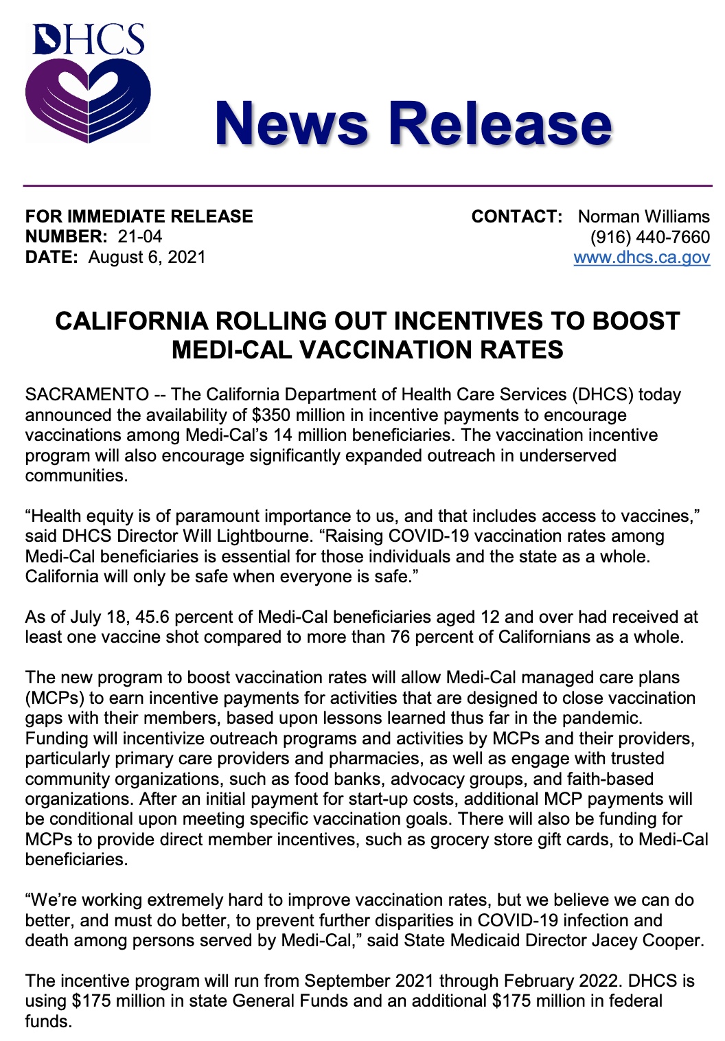$250 million for providers and $100 million for the patients. And it could be added to another CalVaxGrant of up to $55,000 to “help physician practices vaccinate their communities against COVID-19.” Half of the $350 million came from the state’s general fund, half from the feds.