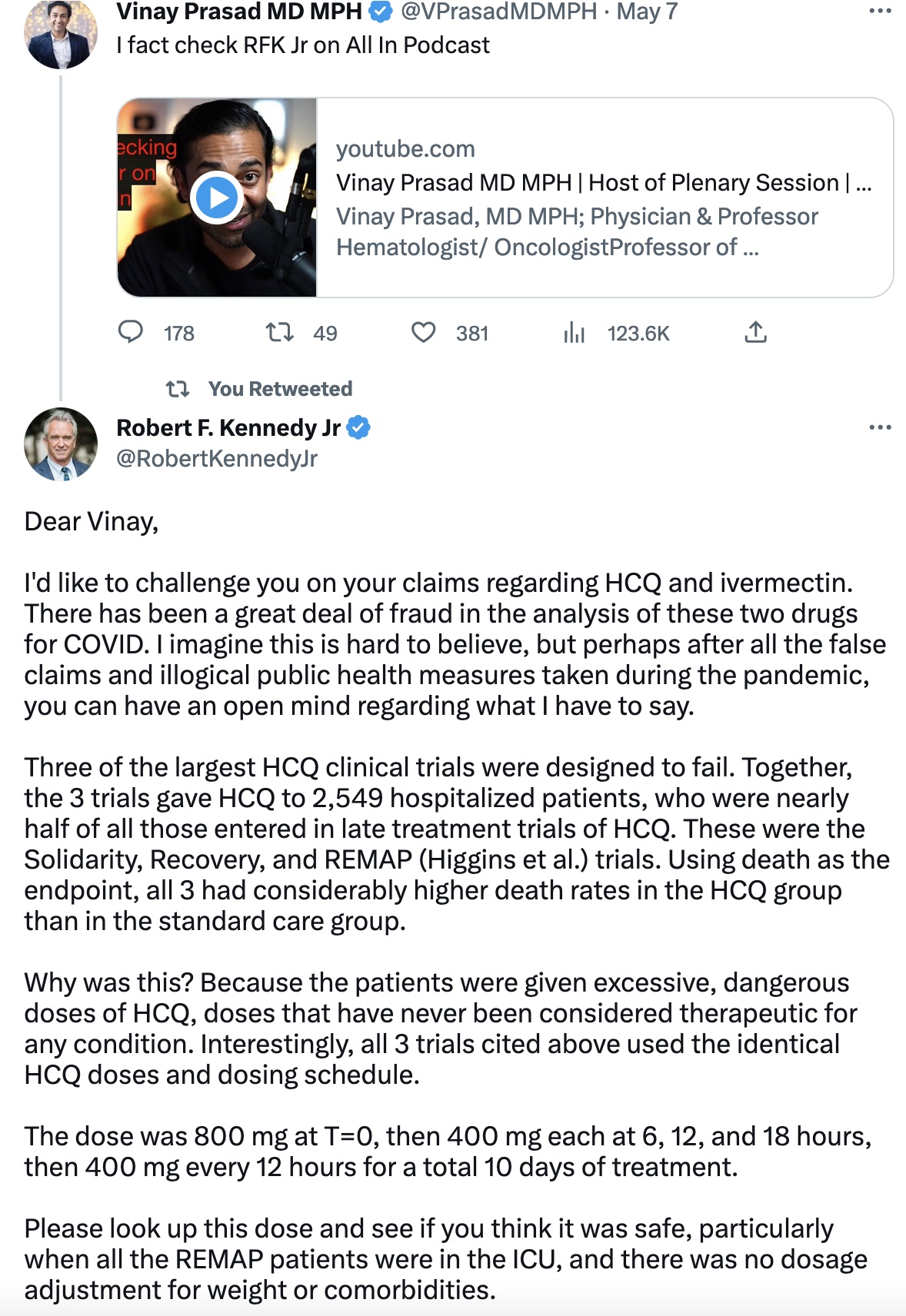 RFK, Jr. vs Dr. Vinay Prasad on whether HCQ and Ivermectin actually work