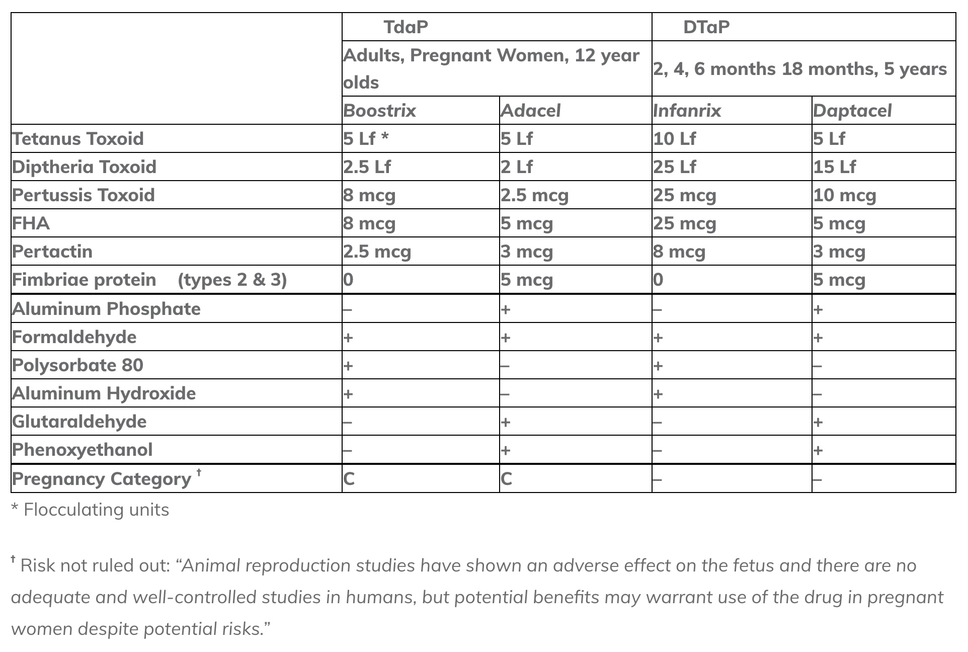 Sanofi’s shots gives babies 2 times the tetanus toxoid, 7.5 times the diphtheria toxoid, and 4 times the pertussis toxoid as adults.