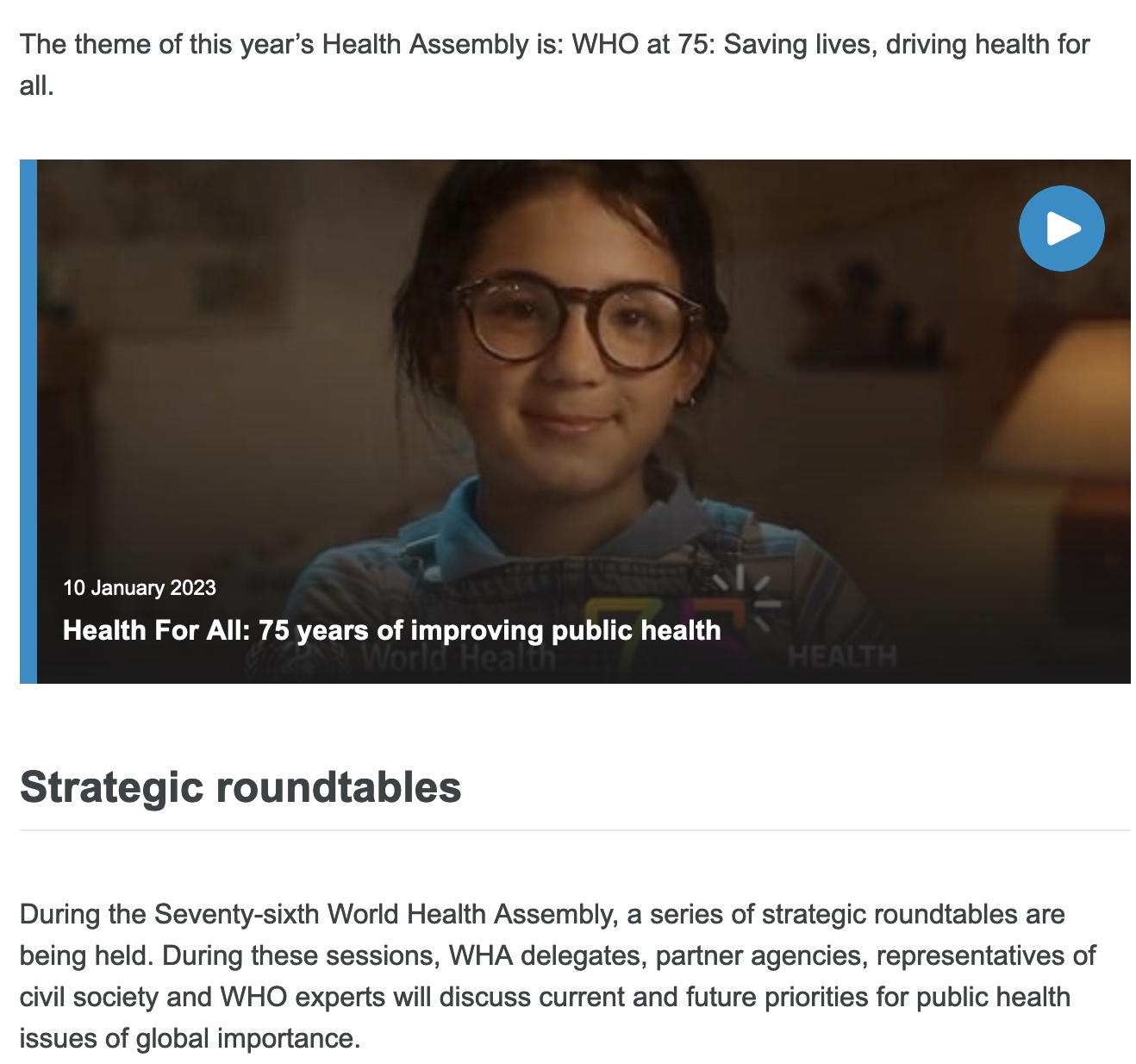 The W.H.O.’s 76th Annual meeting starts tomorrow and runs for ten days. What will they approve? What is the theme?