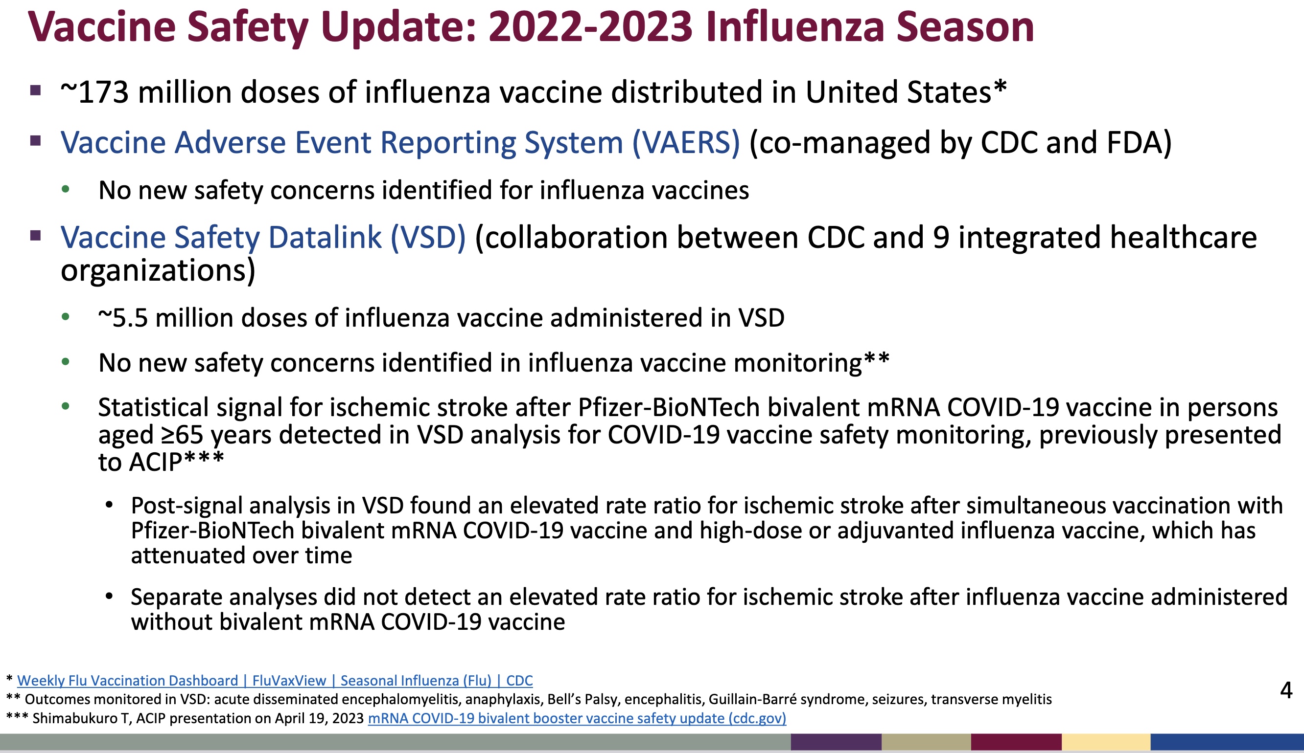 And yes, there were no NEW safety concerns, okay, but what about the OLD ones? If people were given the Pfizer mRNA plus either the MF-59 adjuvanted vaccine or the high test (4x as much antigen) flu shot for elders, they were more likely to wind up with a stroke. But the signal has dissipated over time, because flu season ended and almost no one gets a flu shot after December.