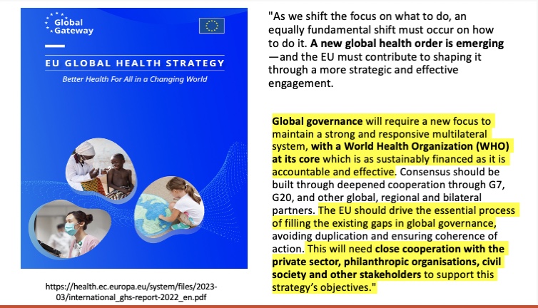 Europe issued its report on its Global Health Agenda in March, and it isn’t about health, it is about making health the driver for the WHO/globalist agenda. No surprise I guess. But to see it in print, with lots of pretty pictures, all spelled out: well, I was surprised. Please take a look at it.