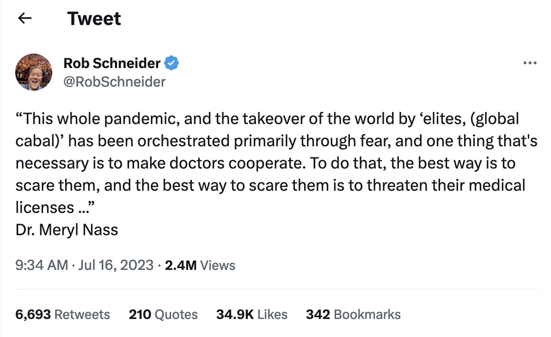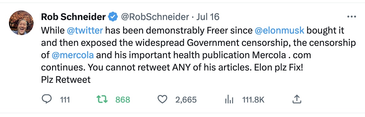 But Rob couldn’t actually direct people to me, because of censorship. I knew that twitter is censoring (seriously shadow-banning to 1 or 2 people only) all posts with a substack address. I did not know that twitter STILL is censoring all Dr. Mercola’s work. Rob Schneider got my quote from the interview Dr. Mercola released 2 days ago. But he couldn’t direct people there, even with Elon Musk owning the platform. See below.