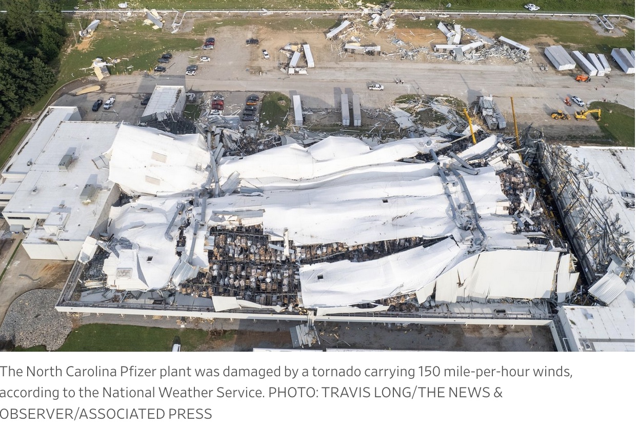 July 19 (Reuters) – Drugmaker Pfizer Inc (PFE.N) said on Wednesday its plant in Rocky Mount, North Carolina, which is one of the largest sterile injectable product facilities in the world, has suffered heavy damage from a tornado.