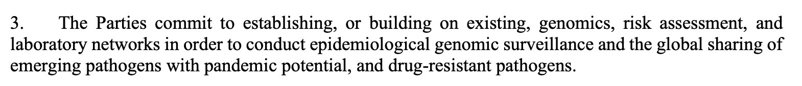 But the WHO in its June 2023 Bureau Text of the Draft Pandemic Treaty has a plan that is the exact opposite of this. In the WHO’s draft treaty, which most nations’ rulers appear to have bought into, all governments will share all viruses and bacteria they come up with that are determined to have “pandemic potential” — share them with the WHO and other governments, putting their genomic sequences online. No, I am not making this up. (See screenshots from the draft treaty below.) Then the WHO and all the Fauci’s of the world would gain access to all the newly identified dangerous viruses. Would hackers also gain access to the sequences? This pandemic plan should make you feel anything but secure.
