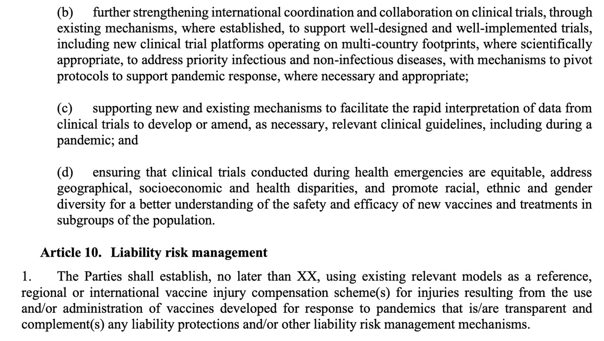 Vaccines normally take 10-15 years to be developed. In case you thought the COVID vaccines took too long to be rolled out (326 days from availability of the viral sequence to authorization of the first US COVID vaccine) the WHO treaty draft has plans to shorten testing. There will be new clinical trial platforms. Nations must increase clinical trial capacity. (Might that mean mandating people to be human subjects in out-of-the-way places like Africa, for example?) And there will be new “mechanisms to facilitate the rapid interpretation of data from clinical trials” as well as “strategies for managing liability risks.”