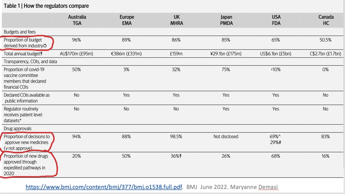 One might predict that the least rigorous regulator would quickly be selected by product manufacturers to make licensing decisions on their products. Most nations’ drug regulators are funded by pharmaceutical firms, who pay for the evaluations. The current price is about $4 million per FDA evaluation. It should come as no surprise that the % of their budgets that is funded by pharma is directly related to the % of drug approvals issued. We might even see the prices of drug evaluations paid by Pharma go up as the quality of the evaluations goes down. Below is fascinating information on the regulators of drugs and vaccines around the world and the public versus private funding they receive.