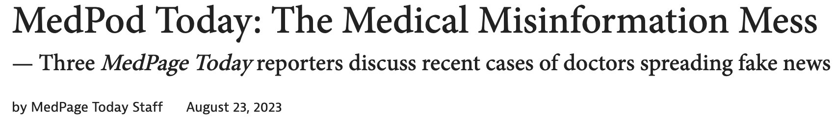 The only way the medical boards can justify punishing doctors like me, Pierre Kory, Peter McCullough, Paul Marik, Sherri Tenpenny, Paul Thomas etc. etc. etc. is by saying we HARMED someone. This article is attempting to buttress those false assertions and does its best to call for laws against misinformation and more punishments for doctors who stray from the CDC’s fairytales.