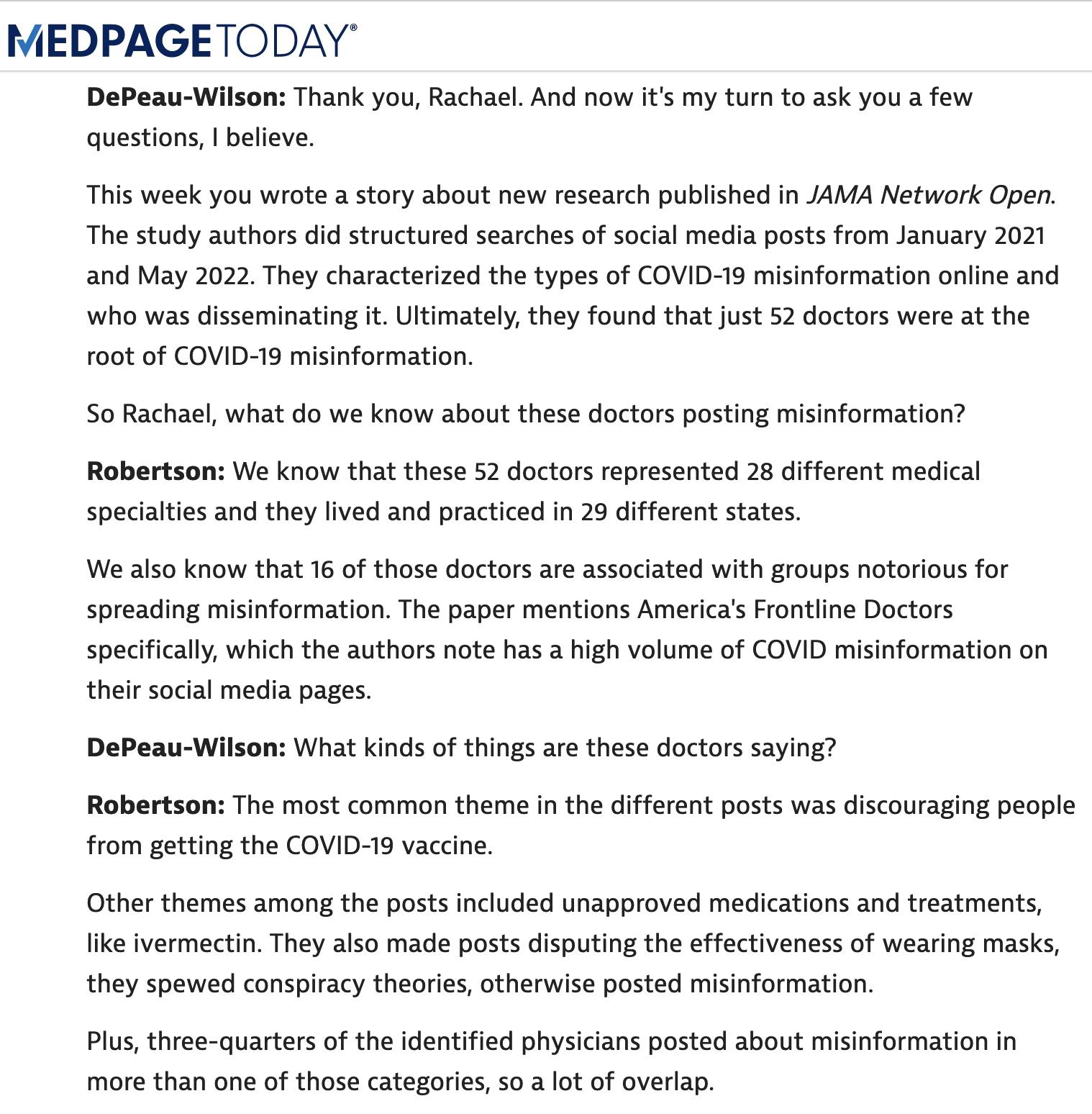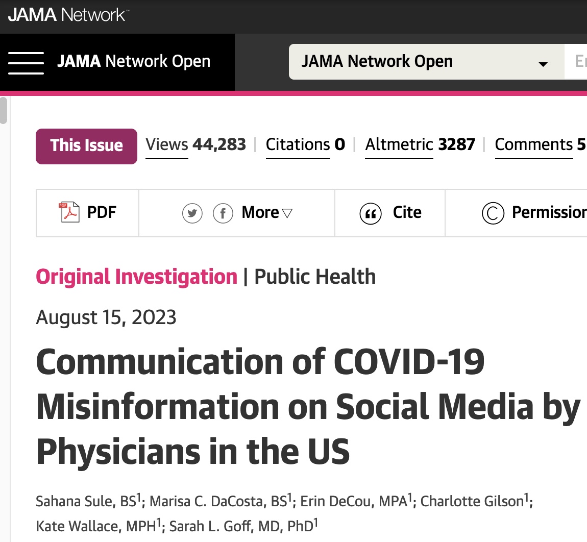 The JAMA paper has actually garnered quite a bit of press. The methodology seems to be random (“mixed methods study” is what the authors call it). The 2 young first authors trolled social media to collect a list of 52 doctors who provided alternative COVID narratives, and misinformation was DEFINED by any disagreement with the CDC.
