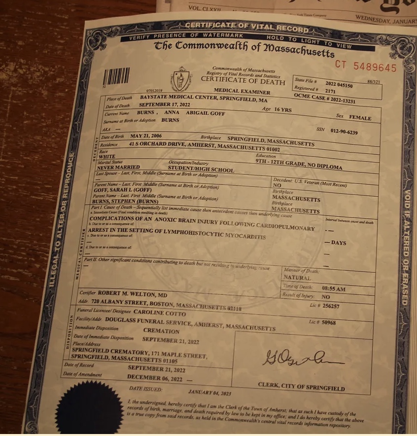 I have written about this story previously, but from a different perspective. Dr. Sarah L. Goff vaccinated her only child for COVID, a beautiful daughter attending Amherst High School, and that child suffered a sudden death at a high school track meet last year.