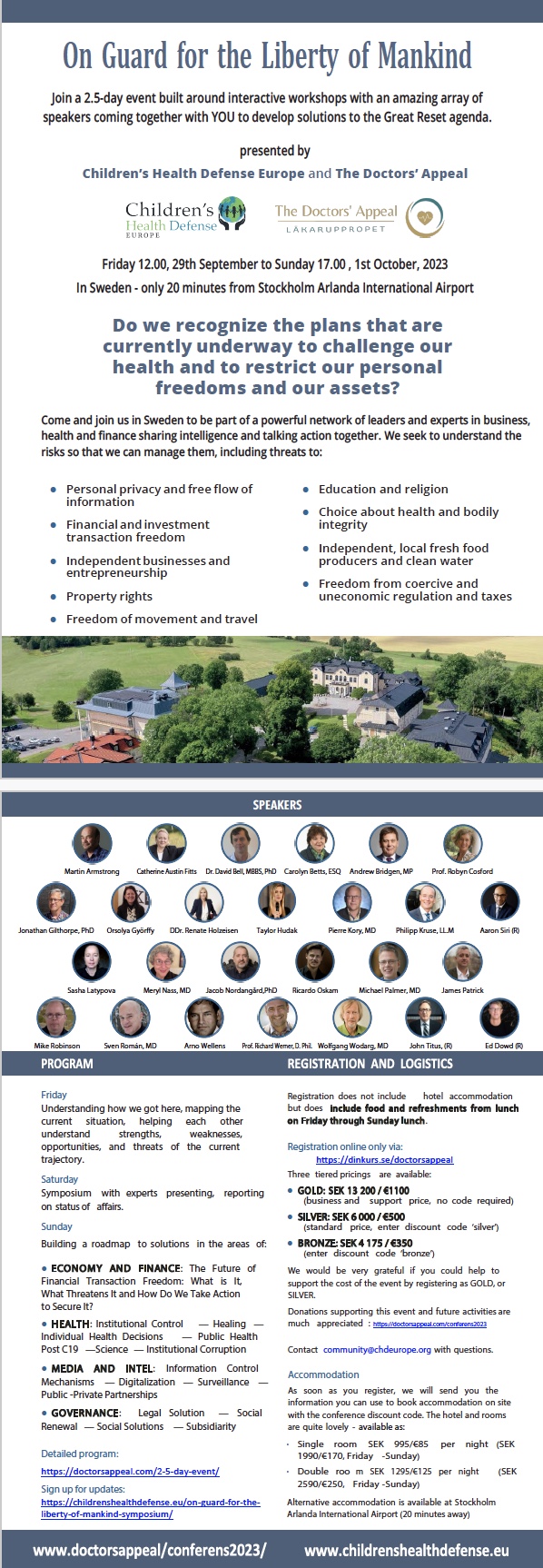 Sept 29-Oct 1, fabulous conference outside Stockholm, Sweden where we plot together how to stop the Great Reset