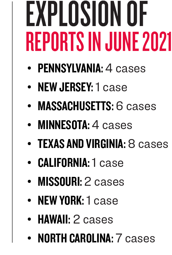 The explosion of reports in June 2021 included a case series of American children as young as 14 suffering from myocarditis shortly after receiving shots and requiring hospitalization. U.S. researchers also reported four cases in Pennsylvania, one case in New Jersey, six cases in Massachusetts, four cases in Minnesota, seven cases in Texas and Virginia, another case in Texas, one case in California, two cases in Missouri, one case in New York, two cases in Hawaii, and seven cases in North Carolina.