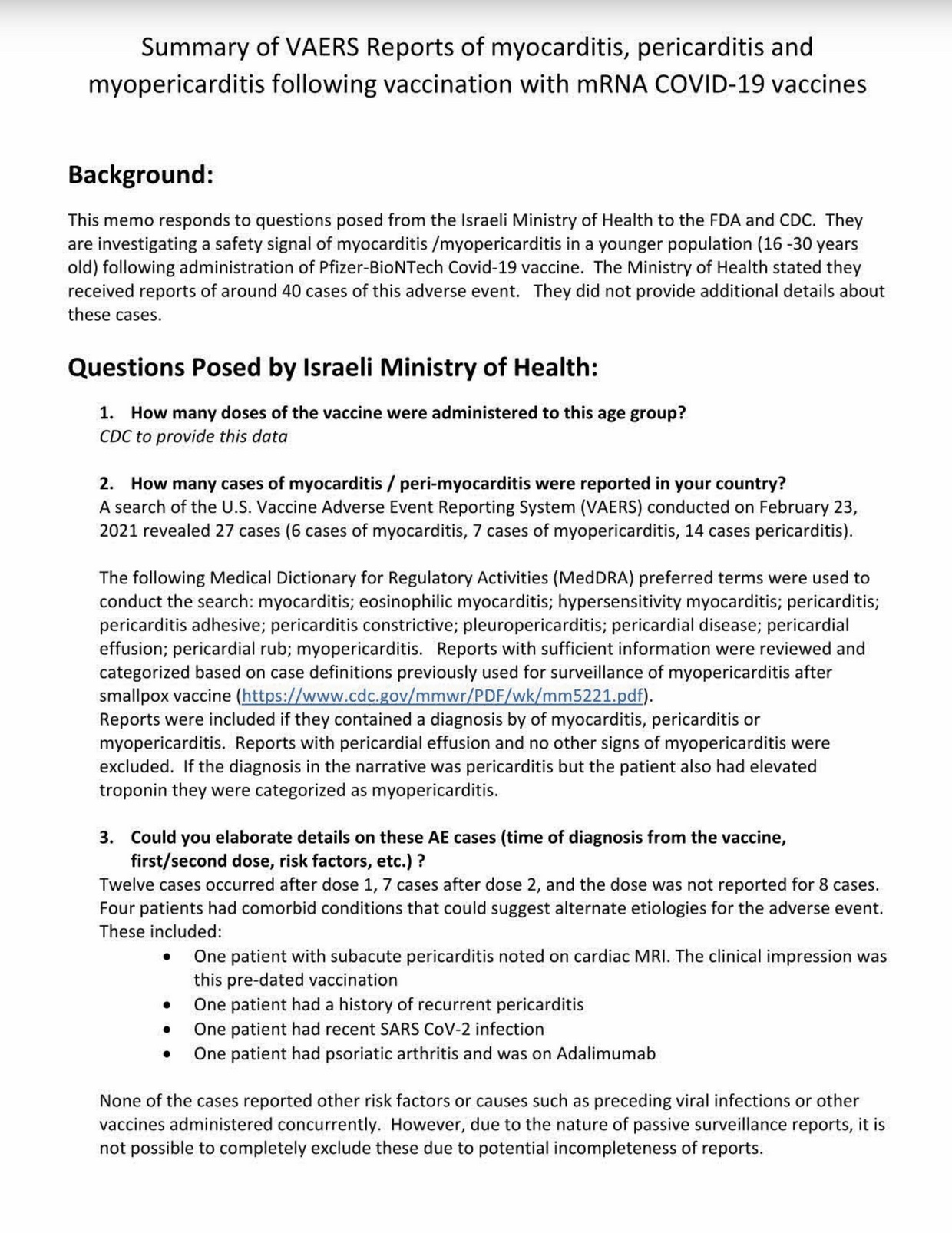 Below is an FDA memo designed for a response to the Israeli Ministry of Health’s questions about myocarditis. Note how FDA uses the VAERS system (which underreports cases by a factor of 10 to 100) instead of using a more accurate database.—Meryl