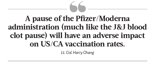“A pause of the Pfizer/Moderna administration (much like the J&J blood clot pause) will have an adverse impact on US/CA vaccination rates,” one military official said in a message obtained by The Epoch Times that was flagged for top CDC officials.