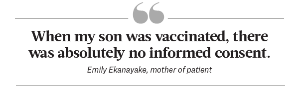 “She said at some point that there wasn’t a link, so we proceeded,” Ms. Ekanayake told The Epoch Times. “So when my son was vaccinated, there was absolutely no informed consent.”