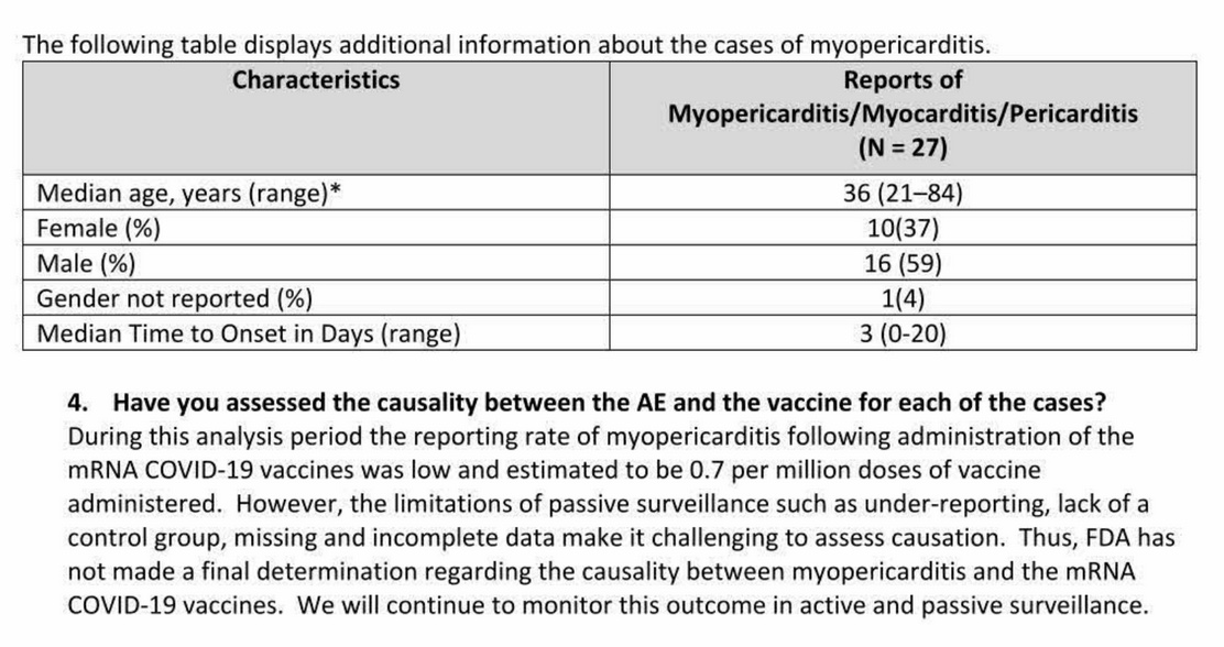 Internally, the warning was designated as “high” importance and set off a review of U.S. data. The review found 27 reported cases in the United States, according to a U.S. government memorandum dated March 9, 2021. The incidence rate was low, but “missing and incomplete data make it challenging to assess causation,” the memo stated. The U.S. Food and Drug Administration (FDA), it said, “has not made a final determination regarding the causality.” [But because the FDA has access to about 20 different databases it could have used to asess the rate of yocarditis as well as causality, a final determination should not have taken more than a few days or week.—Nass]