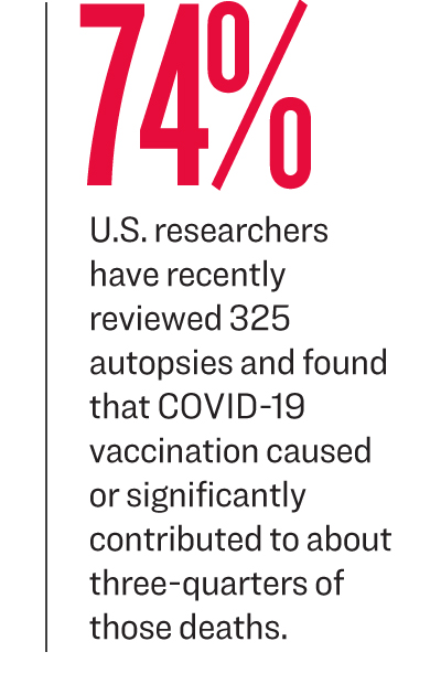 U.S. researchers who recently reviewed 325 autopsies found in a preprint paper that COVID-19 vaccination caused or contributed to about three-quarters of those deaths, including nine involving myocarditis.