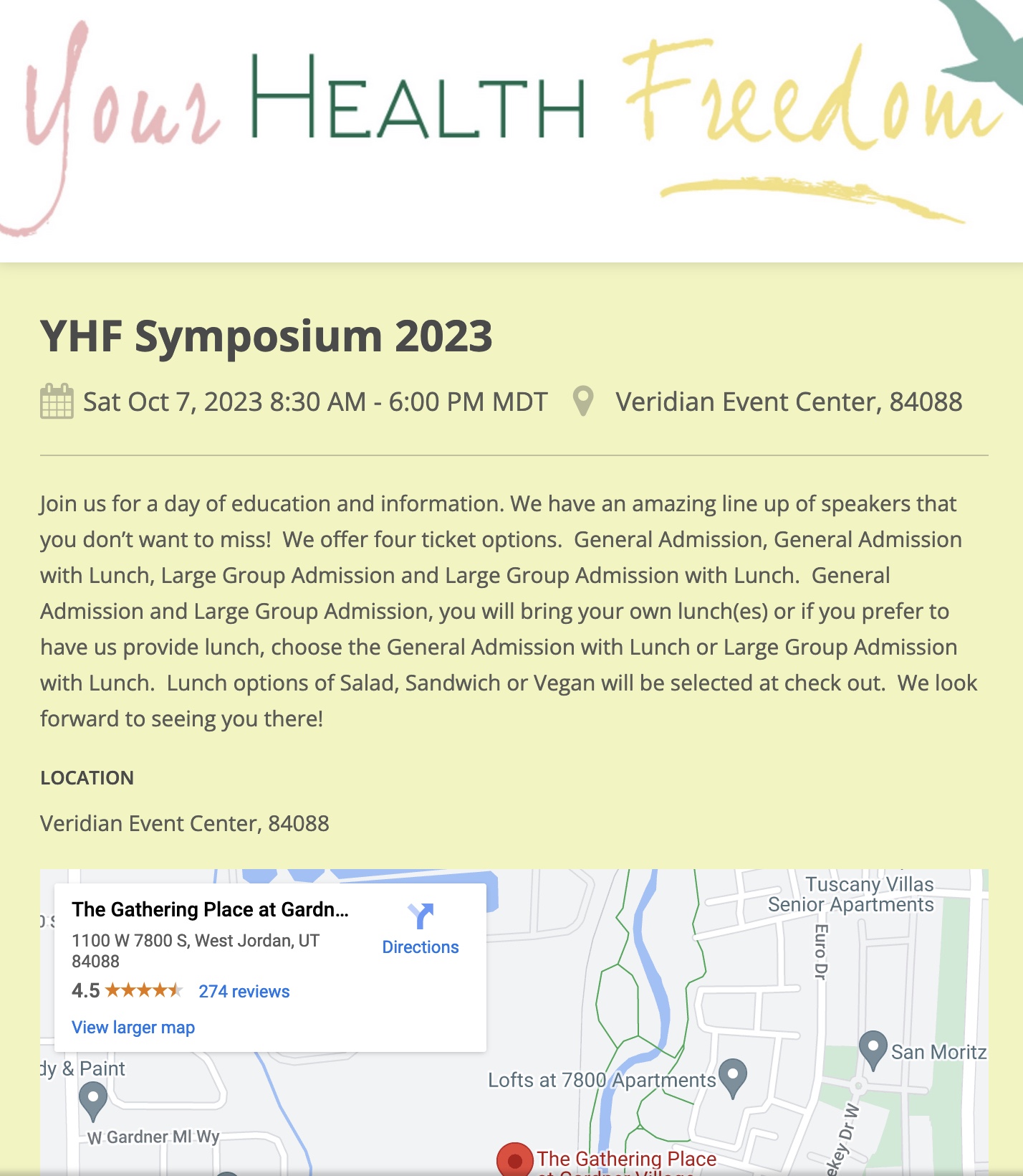 Salt Lake City, Utah symposium (10/7) and gala dinner event (10/6) this weekend, put on by Your Health Freedom.