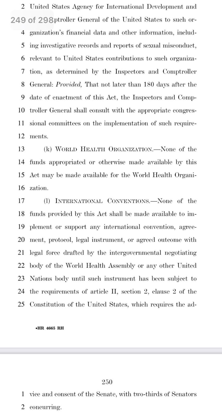 Huge Cheer: the Foreign Operations Appropriations Bill has passed, and there is no money for the WHO. Plus, the bill requires Senate ratification of the treaty