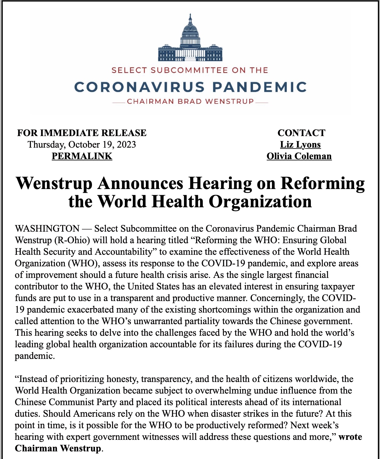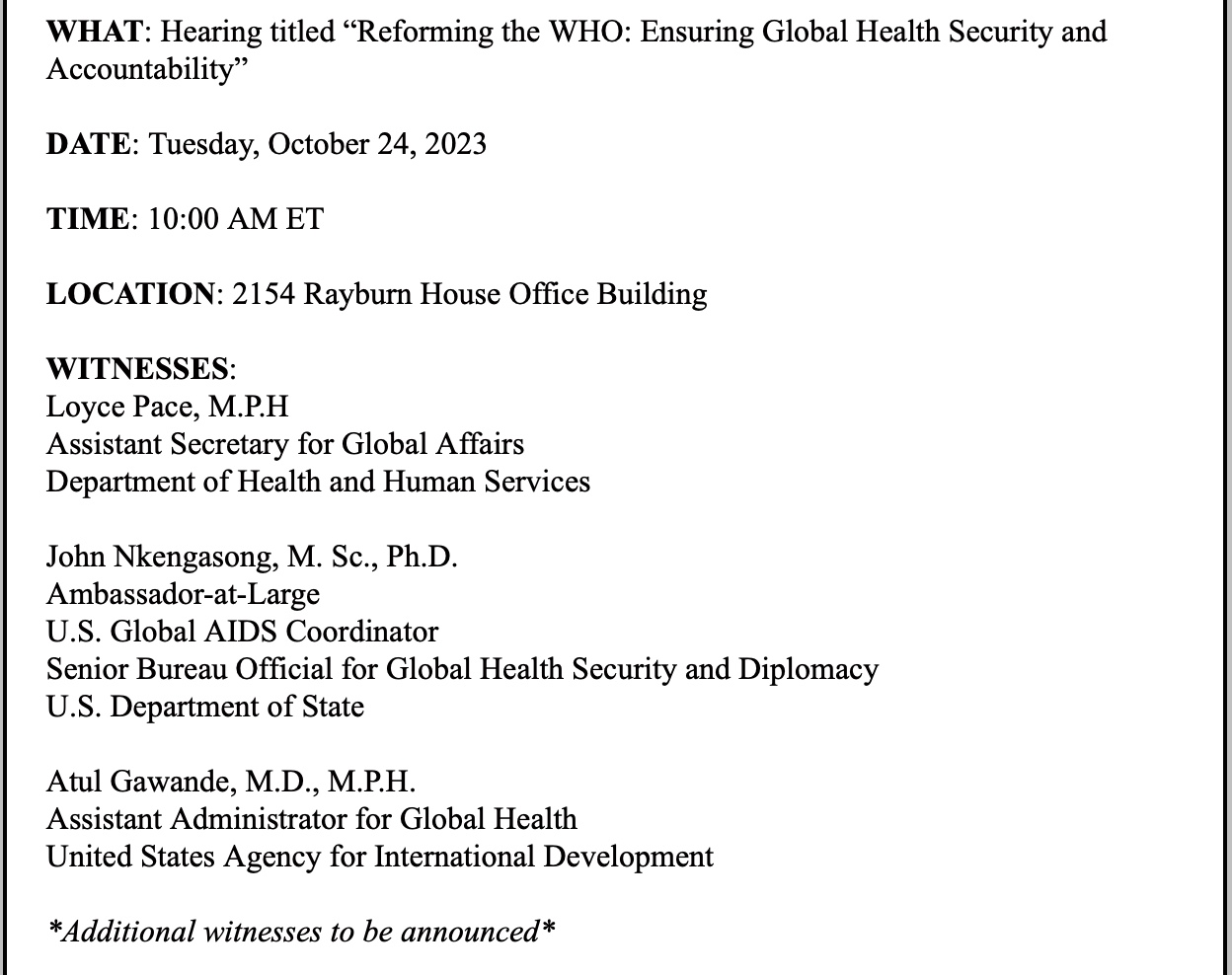 The witness list does not include anyone who will criticize the WHO. It seems a critical omission. But additional witnesses to be announced.