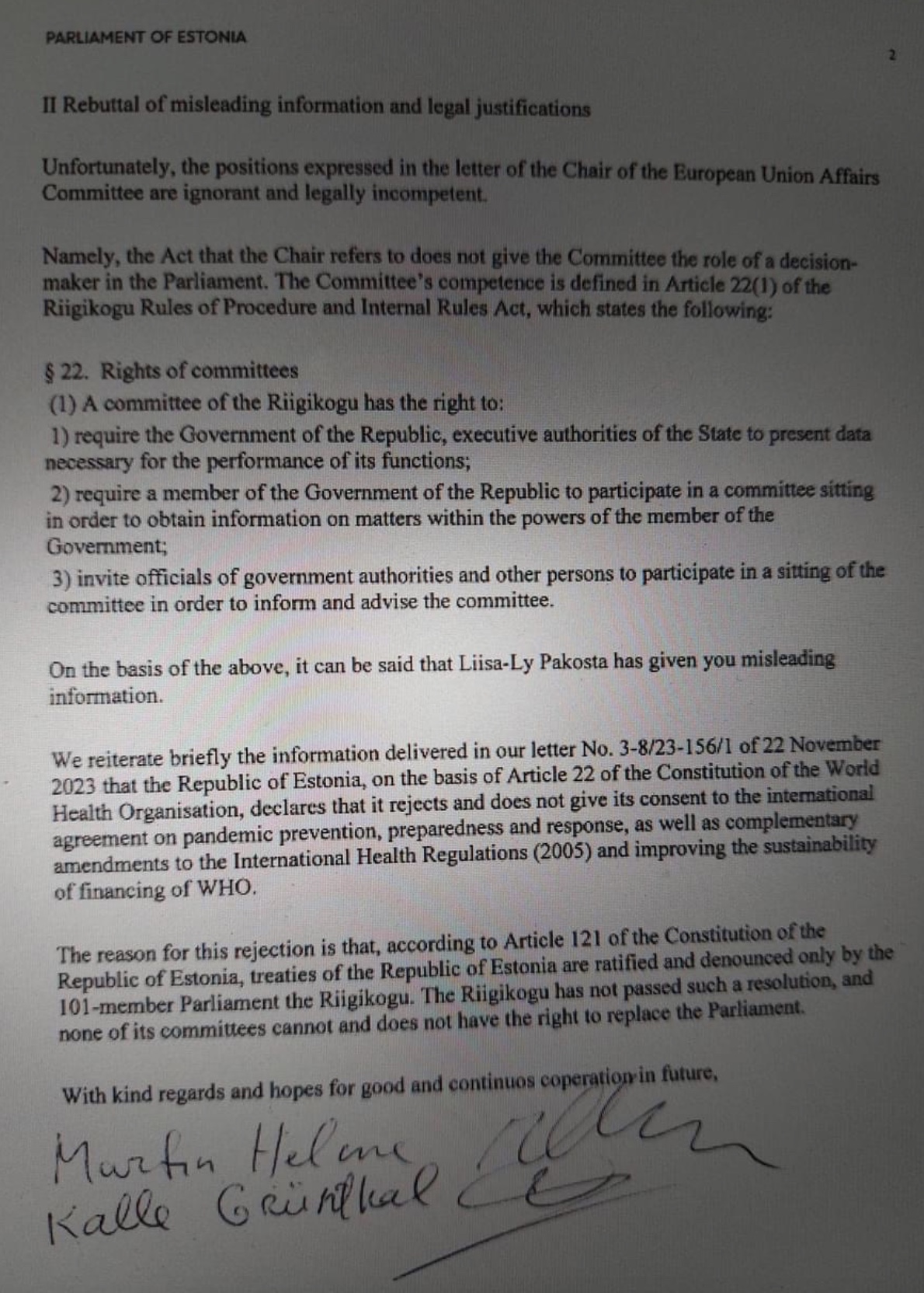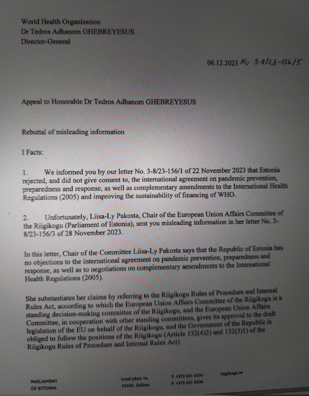 Liisa-Ly Pakosta, the chair of a Parliamentary committee that had approved the negotiations then wrote to the WHO, instructing it to ignore the parliamentarians, claiming they were wrong.