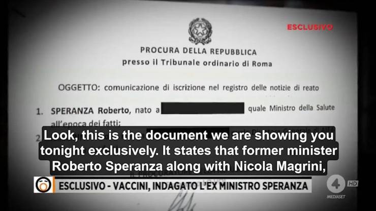 Well, today, Roberto Speranza is under investigation for lies he allegedly told about vaccines. Among the crimes he is accused of are ideological falsehood and murder. Look, this is the document we are showing you tonight, exclusively. It states the former minister, Roberto Speranza, along with Nicola Magrini, the former general manager of AIFA, are both registered in the investigative records of the Rome Prosecutor’s Office.