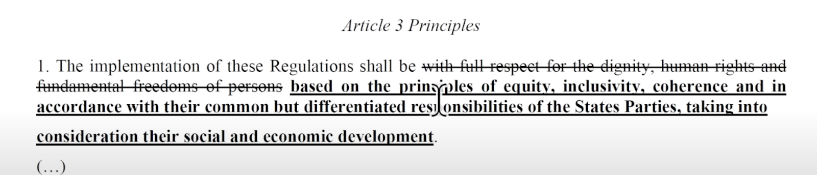 This is where the 2005 IHR – which, as preexisting regulations, do not require ratification – come into play. While the WPA was being drafted, concurrently, a group of member state representatives were convened to amend the 2005 IHR so that the non-legally-binding WPA “recommendations” become legally-binding edicts that convey greater power to the WHO. Removal of the term “non-binding” in Article 1 of the amended IHR will accomplish this. Amendments to Clause 1 of Article 3 addressing the principles governing implementation of the Regulations have replaced “shall be with full respect to the dignity, human rights, and fundamental freedoms of persons” with “shall be based on the principles of equity, inclusivity, coherence, and in accordance with their common but differentiated responsibilities of the States Parties, taking into consideration their social and economic development.”