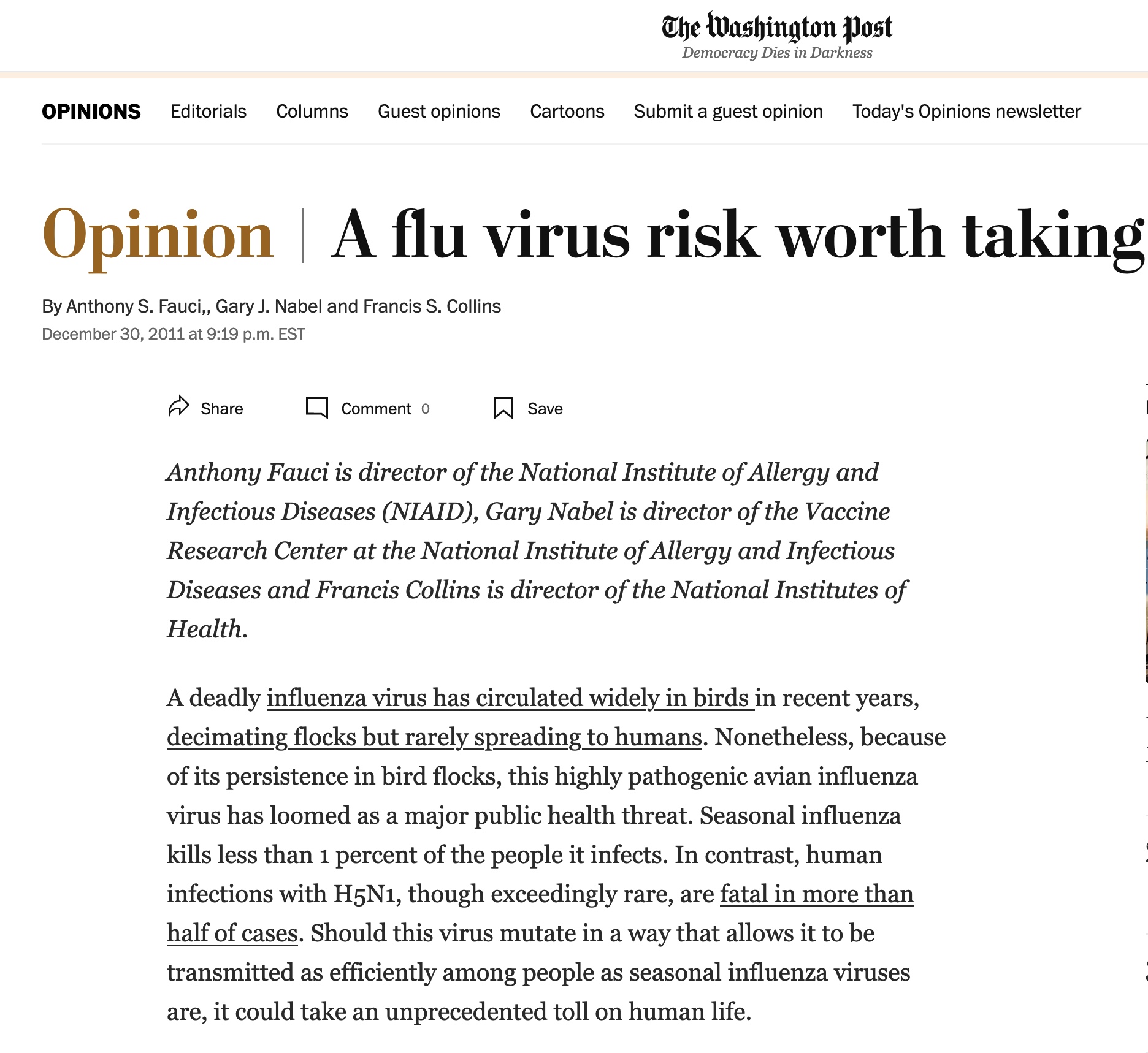 *Important* blast from the past: Tony and Francis explain why creating dangerous viruses with taxpayer money is a “risk worth taking”–and I debunk their bird flu fairytale of woe.