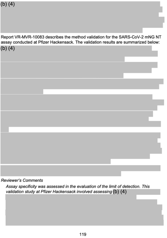 As a poignant visual example, a single redacted page in a longer FDA regulatory summary (shown below) is part of a 127-page document (only 63 pages of which have been shared, and of those 63 pages, around 50% has been redacted) on how to evaluate the purity, concentration, and other analytical measures of mRNA injections.