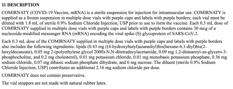 The above cut-and-paste excerpt from the package insert is all of the information manufacturers are sharing with consumers regarding the dose – which is woefully inadequate as compared to all other FDA labels – or anyone who is curious to know anything beyond how much fluid to inject and the 30 or 100mcg concentration of an unspecified mRNA sequence.