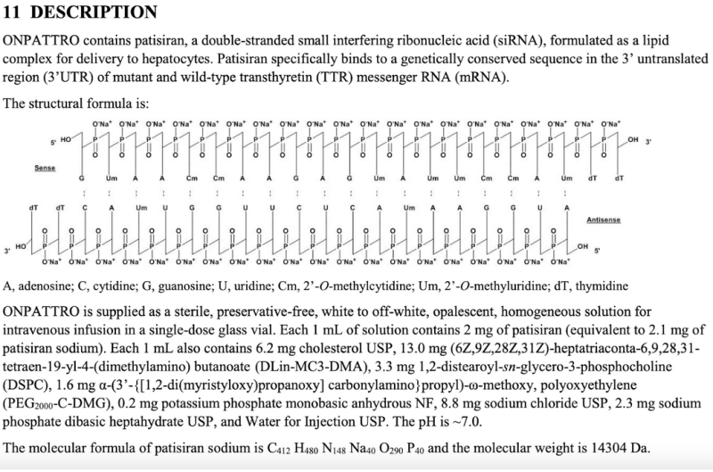 The lack of clarity on the number of sequences of mRNA shots and other critical information is in direct contrast to another FDA-approved RNA-based drug – patisiran (Onpattro®). Onpattro transparently provides the sequence, molecular weight, and milligram strength of its products within official FDA package labeling as illustrated in an excerpt below: