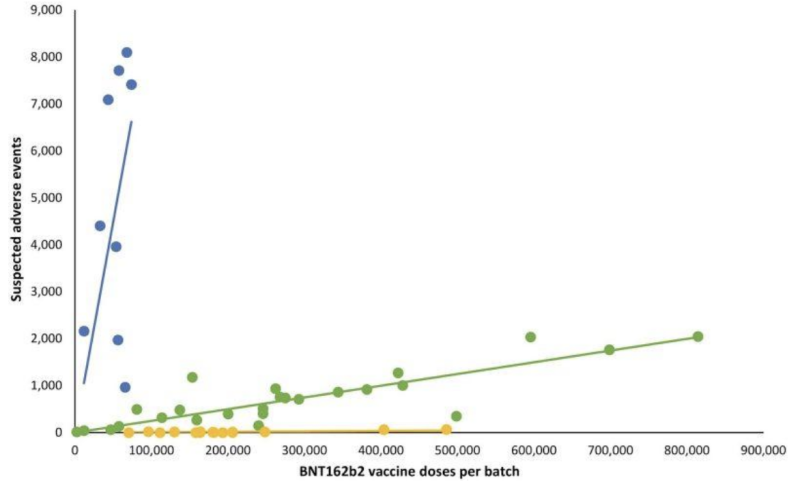 In the line graph which follows, different colored dots represent different batches of Pfizer-BioNTech’s mRNA injections. It separated out batches into three different categories; high- low- to (nearly) absent number of reported adverse event groups (blue, green, and yellow plots respectively).