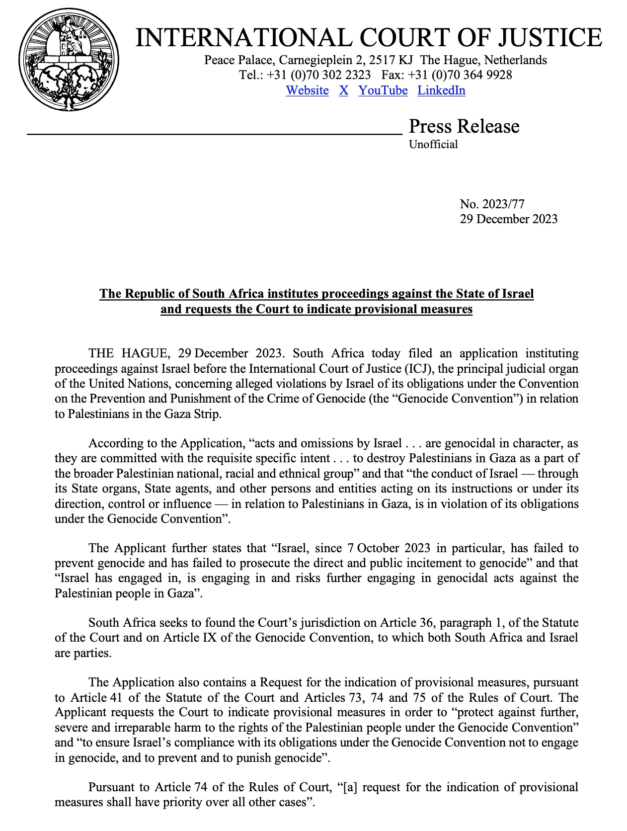 South Africa takes Israel to the International Court of Justice for violating the Genocide Convention, of which both are parties