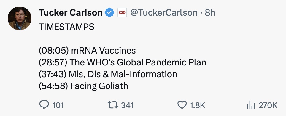 Amazing interview with Tucker Carlson that everyone should watch. Can be played at 1.5x speed. Posted in full (1 hr) on X/ twitter
